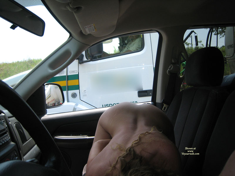 I think he liked this pose too. He kept honking his horn and grinning real big as I played with my pussy from underneath. I hope you enjoyed looking at these pics as much as I did taking them.